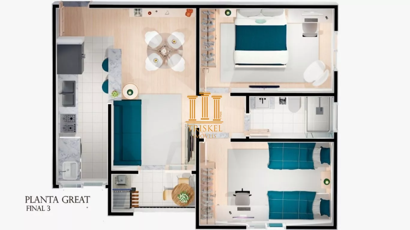 - 54 m² e 57 m² com 2 dormitórios, cozinha americana e varanda com churrasqueira.