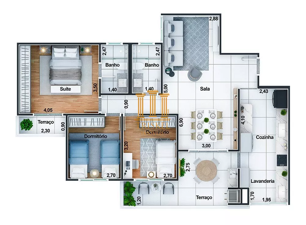 Para maior comodidade o apartamento já possui pontos de ar-condicionado nos dormitórios e na sala.